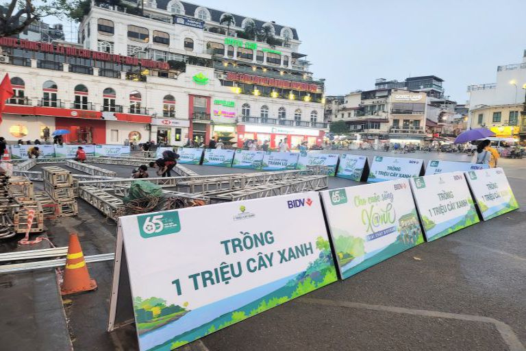 - Chất liệu & kết cấu: Hàng rào sắt + banner bạt Hiflex in theo maket